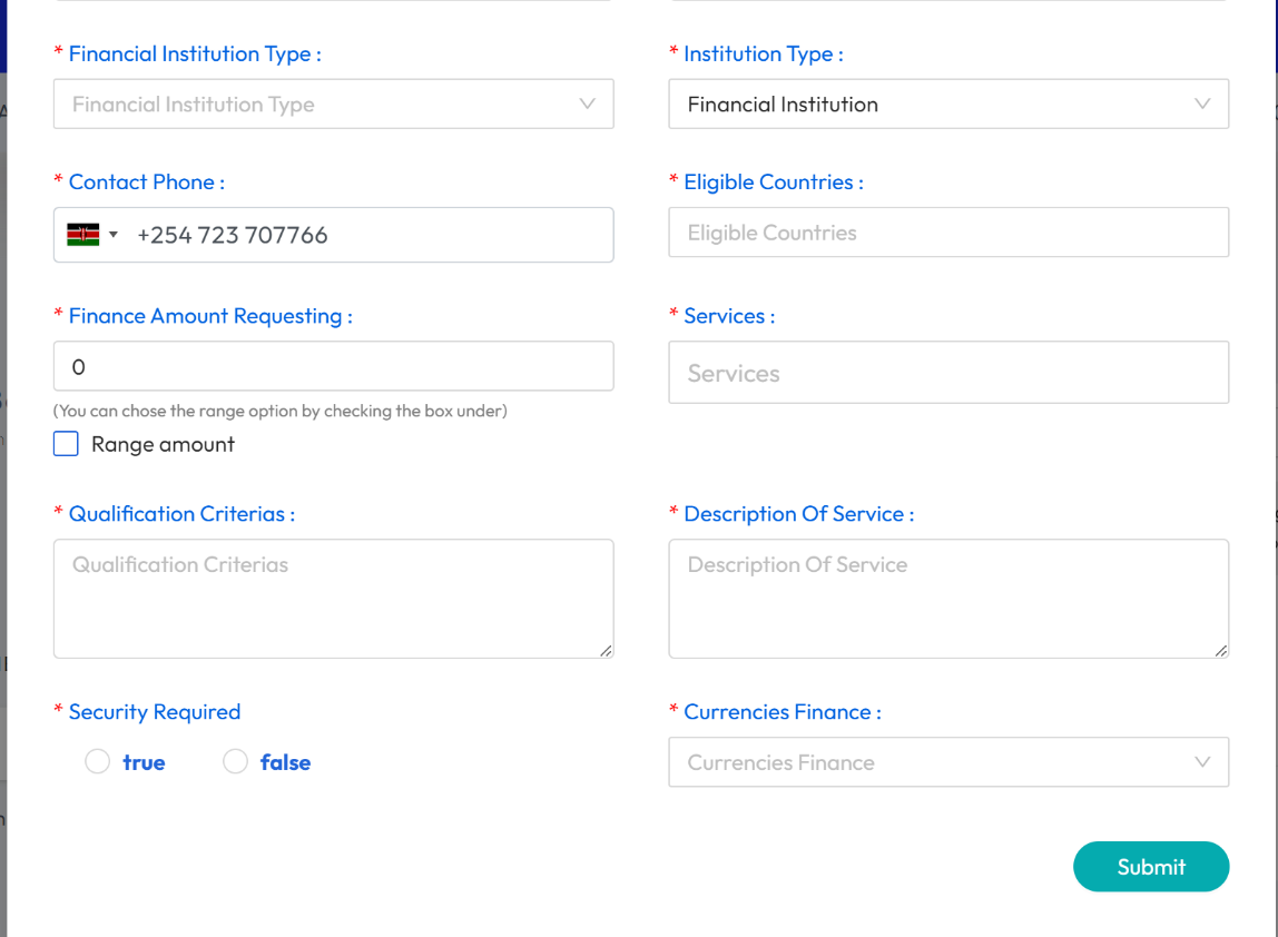 - Once the admin approves your application as a finance provider, you have successfully added your financial institution as a Finance Service Provider.
